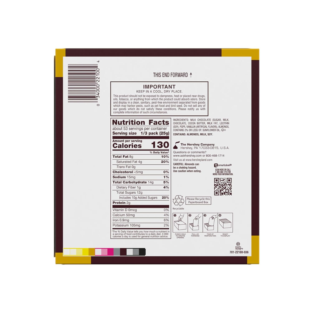 - Contains eighteen (18) 2.6-ounce HERSHEY’S Milk Chocolate with Whole Almonds King Size Candy Bars in a bulk box