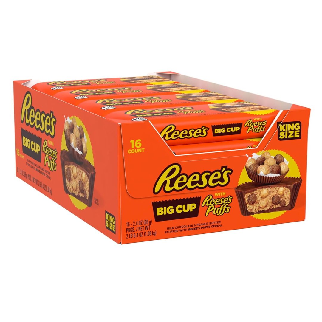 - Contains sixteen (16) 2.4-ounce king size packs of REESE’S Big Cup Milk Chocolate Peanut Butter Cups Stuffed with REESE’S Puffs Cereal Candy in a bulk box