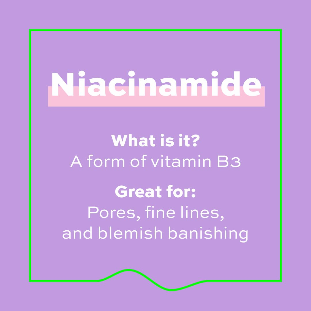 - Niacinamide is a form of vitamin B3, when applied to the skin it can help build keratin that keeps skin firm and healthy. It can also minimise blemishes, pores, fine lines and boost moisture retention.